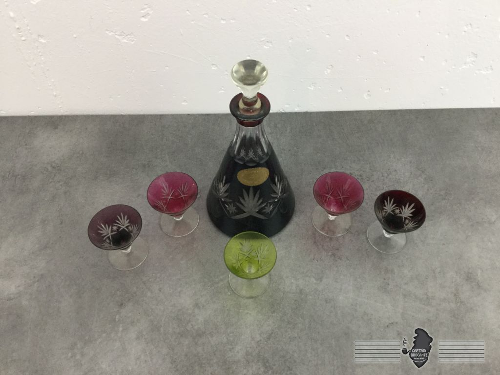 Ce service se compose de 5 verres à liqueurs et une carafe. L'ensemble est en très bon état.