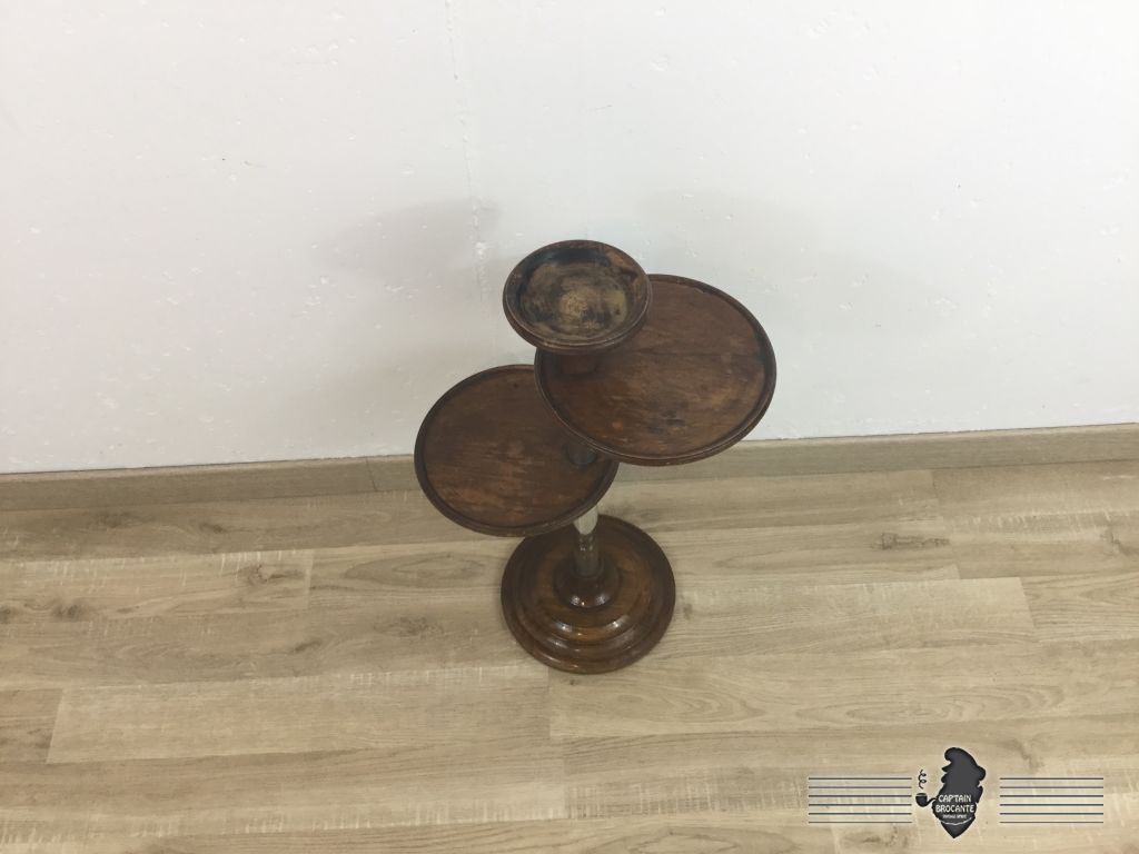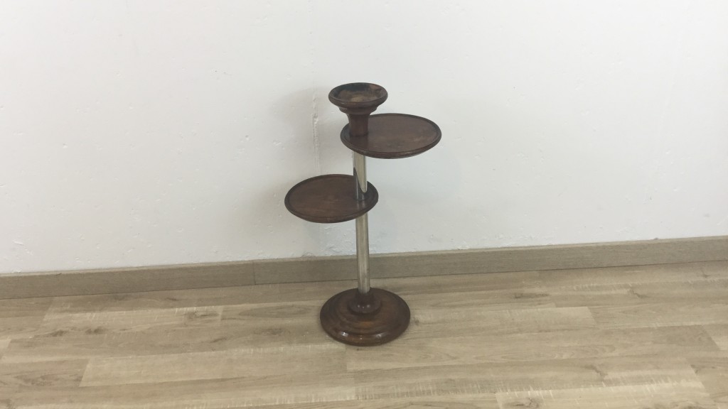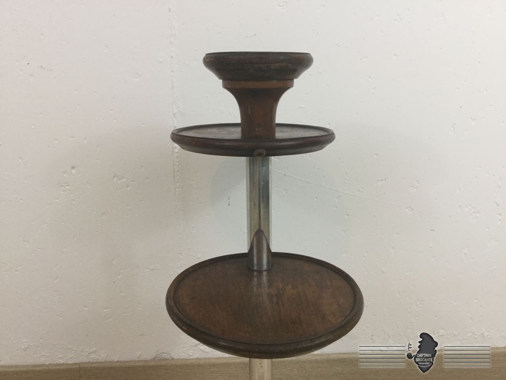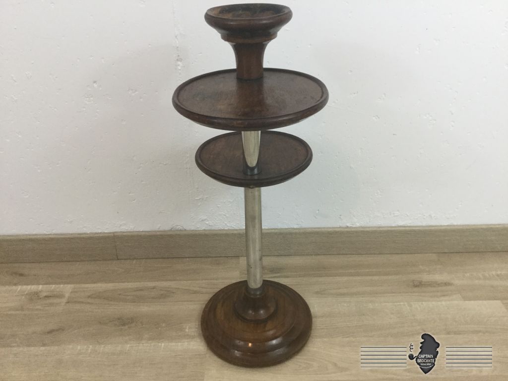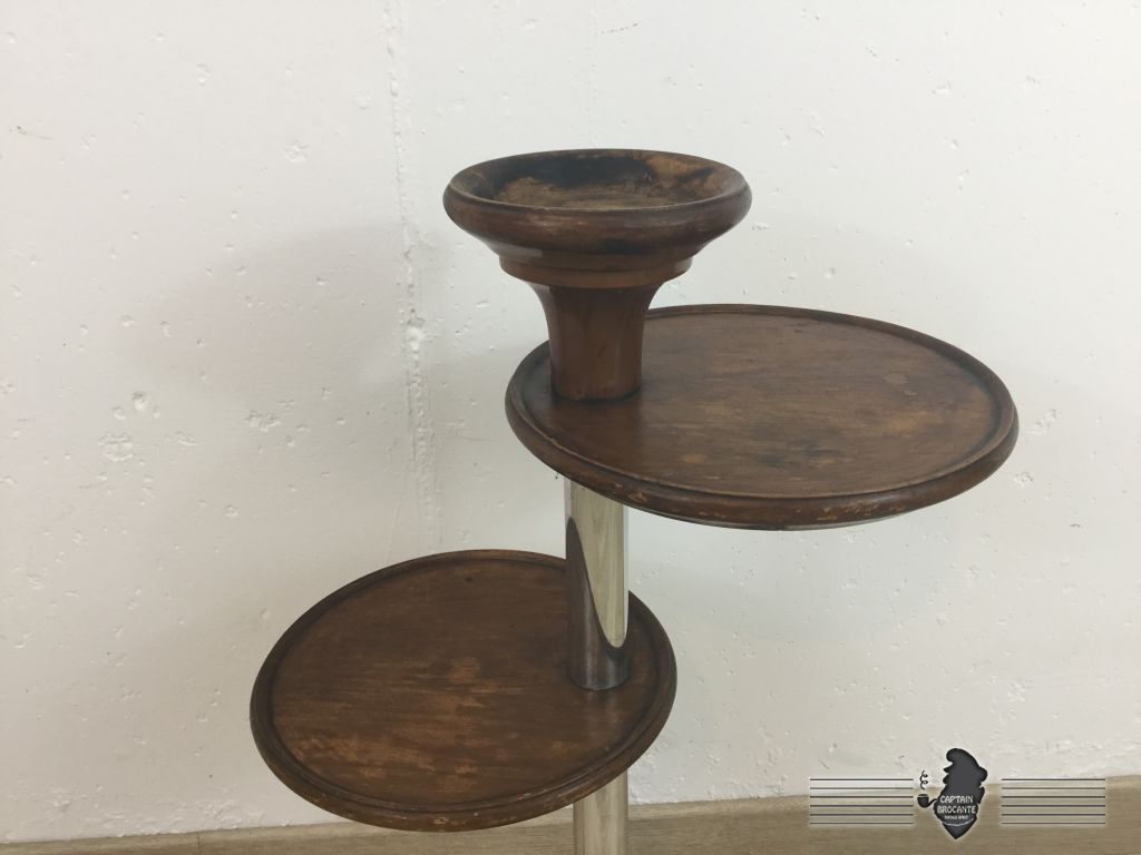Piétement, plateau et cendrier en bois, tige en métal. traces d'usures sur les plateaux et cendrier.
