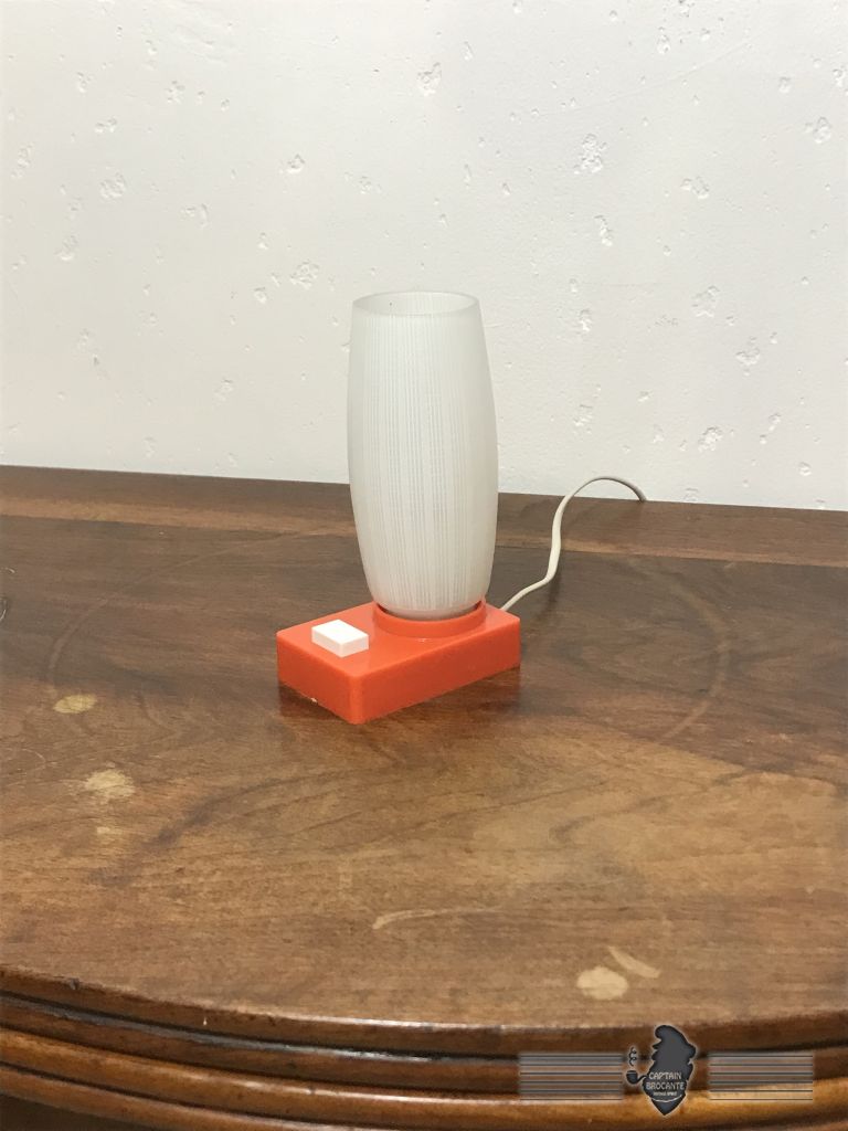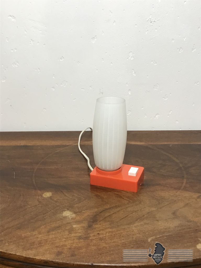 Socle en plastique orange, abat jour en verre.