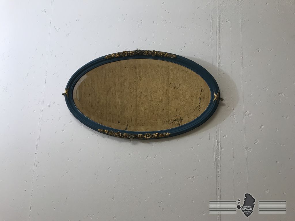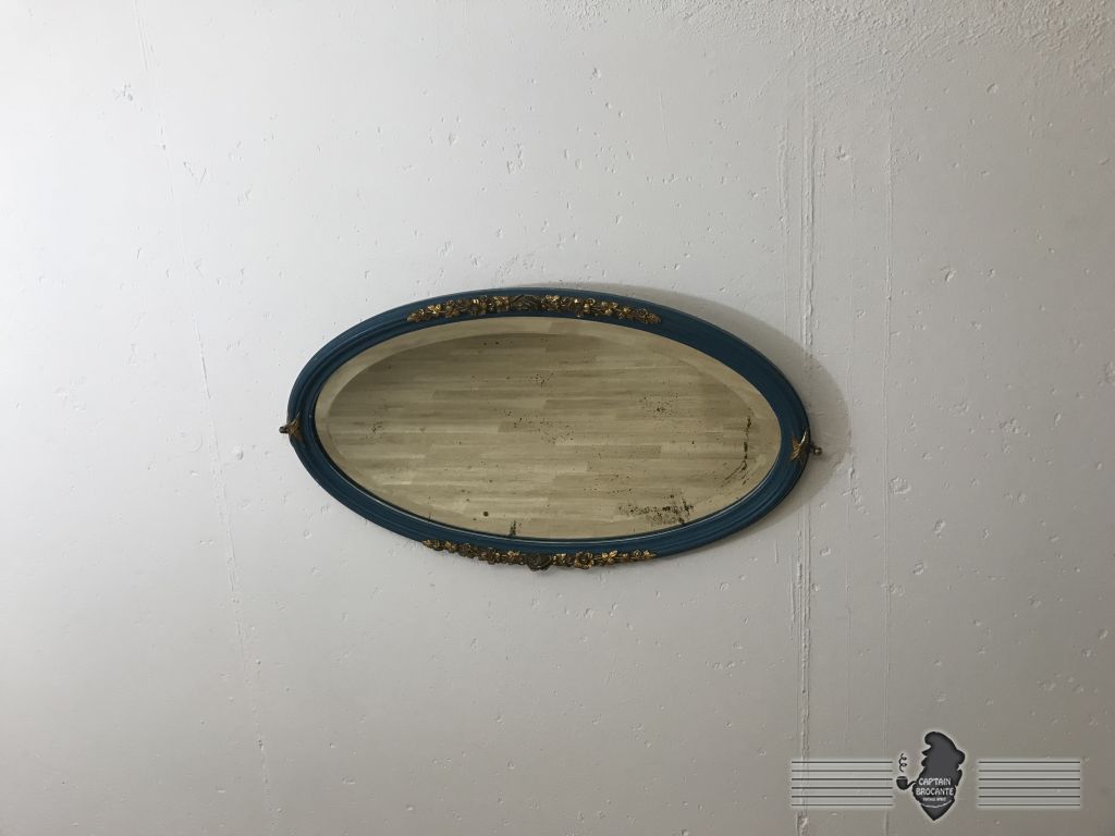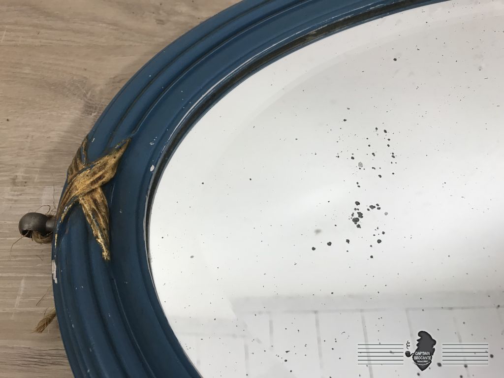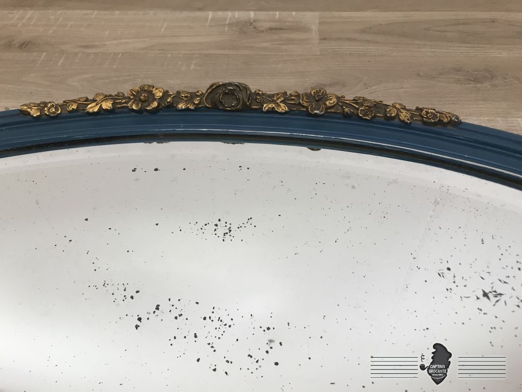Très beau miroir de couleur bleu datant des années 1920. Les décorations en stuc sont dorées.