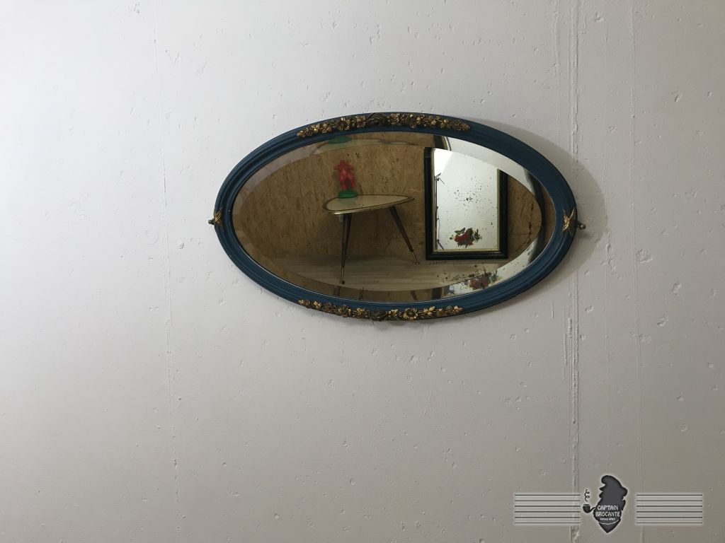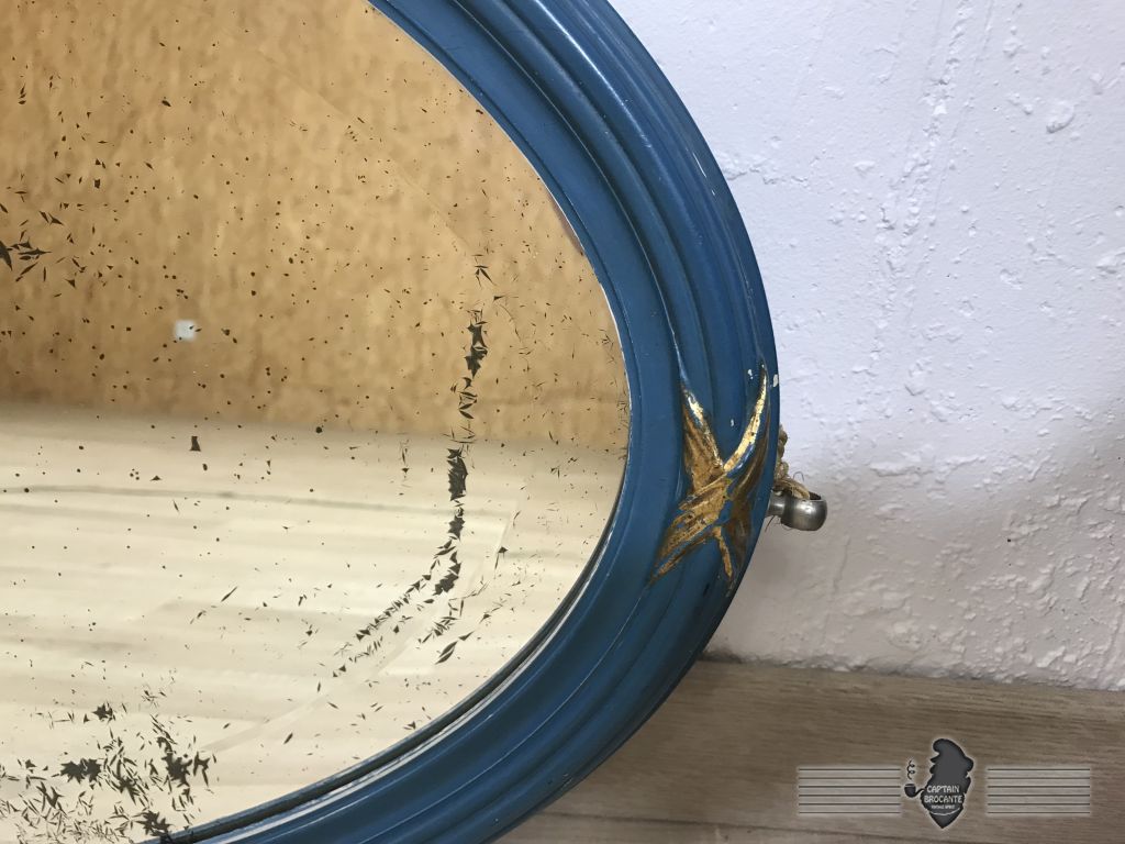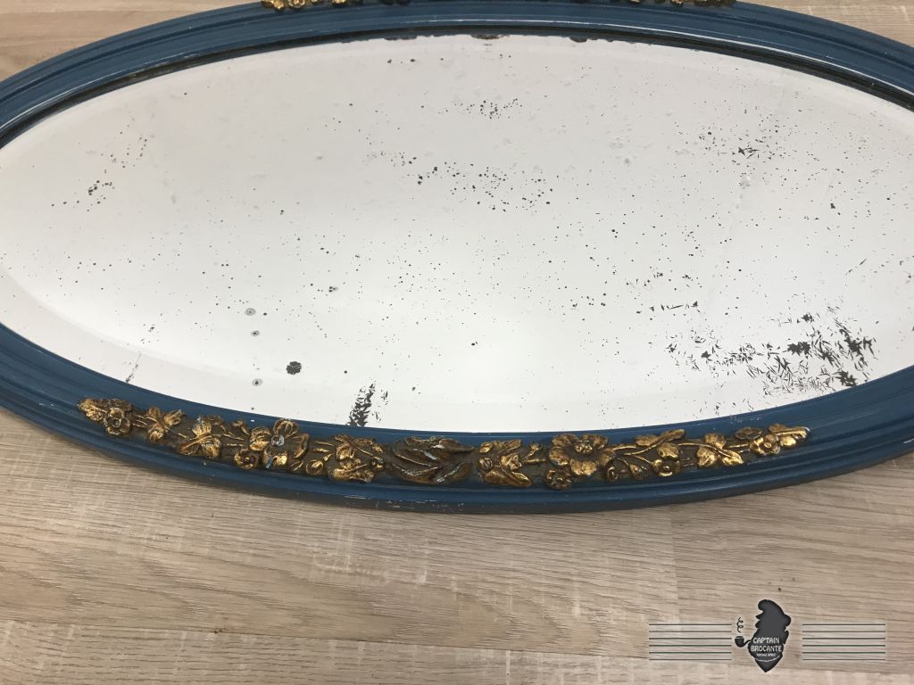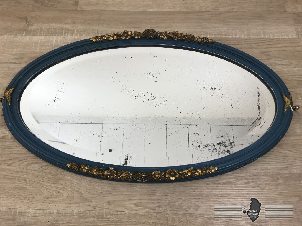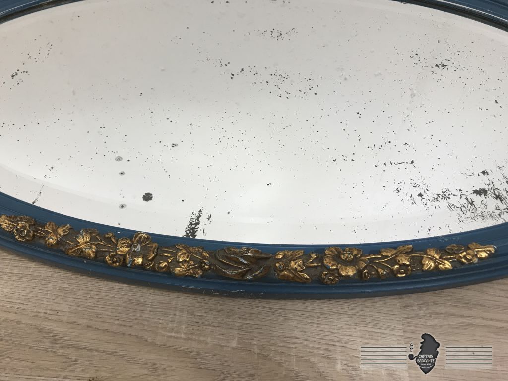 Très beau miroir de couleur bleu datant des années 1920. Les décorations en stuc sont dorées.