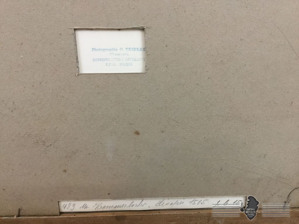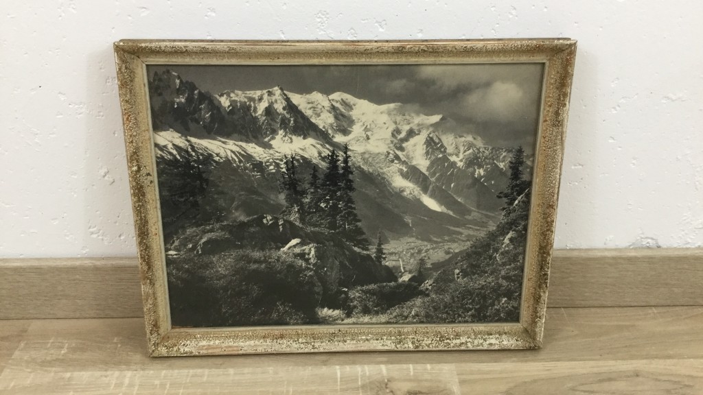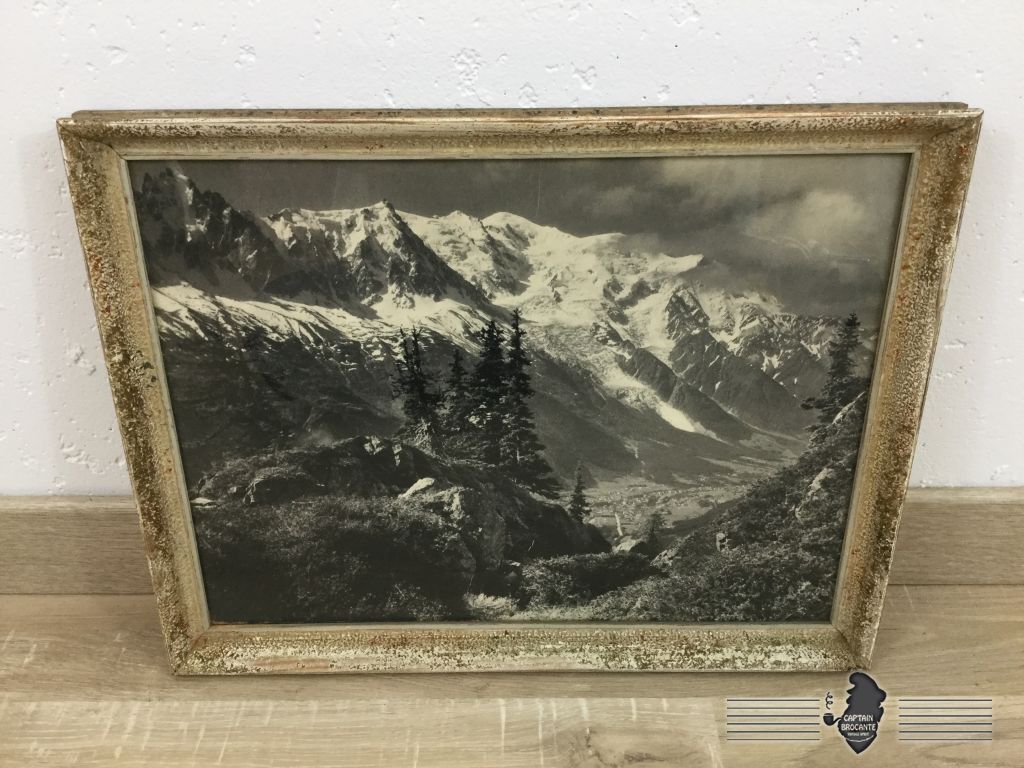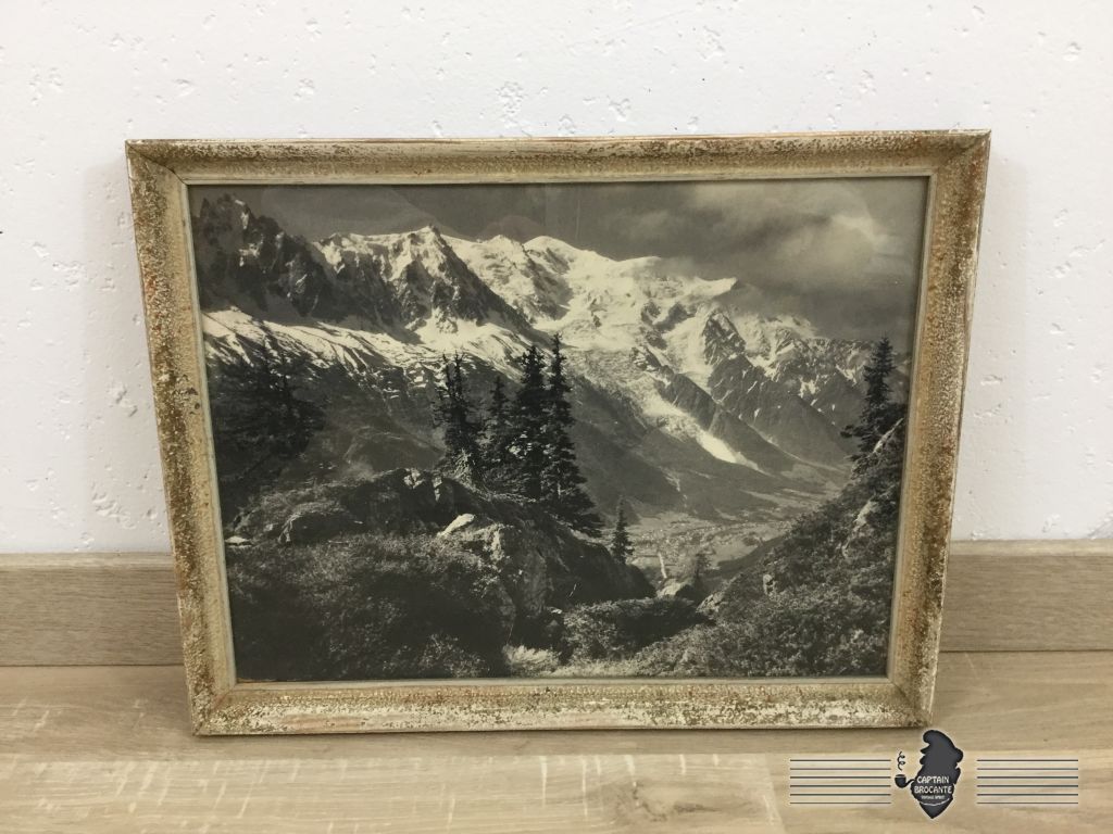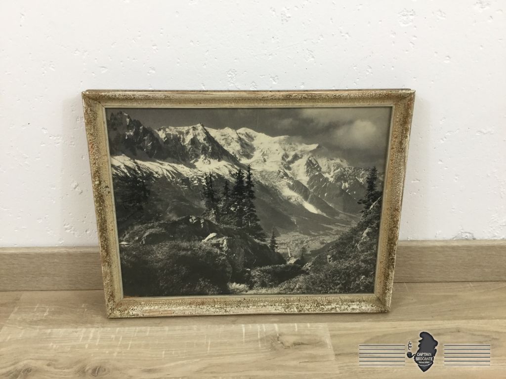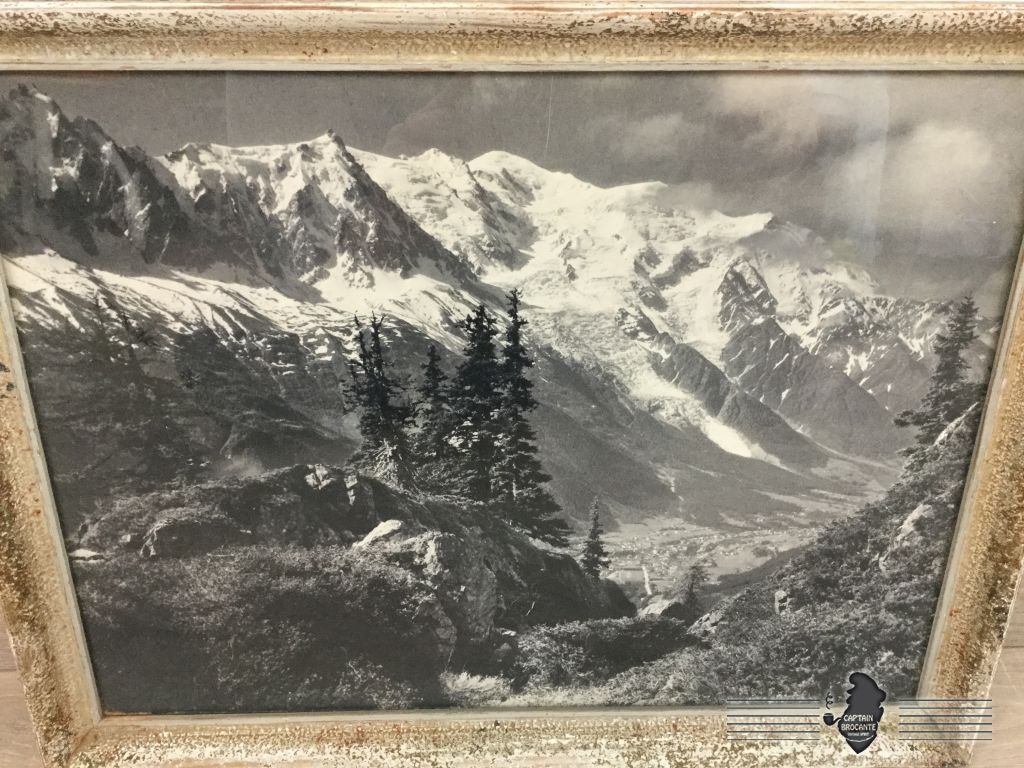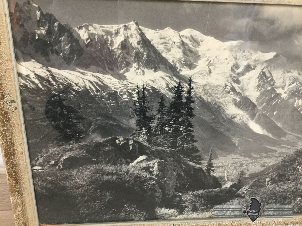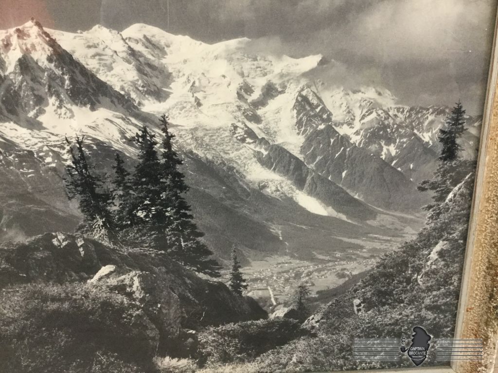 Magnifique photo dans son cadre de la ville de Chamonix dans un superbe paysage Alpin avec le Mont Blanc en arrière plan. Marqué sur l'arrière de la photo au tampon "Photographie G. TAIRRAZ Chamonix REPRODUCTION INTERDITE S.P.A PARIS", plus une annotation au crayon.
