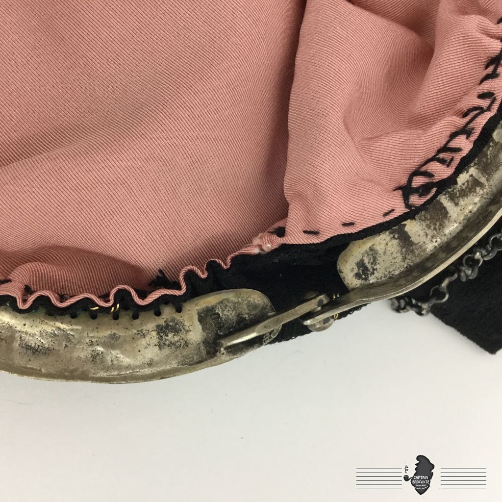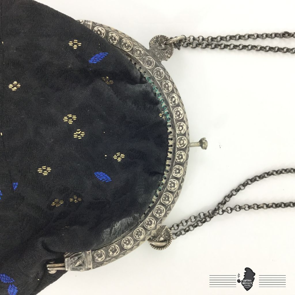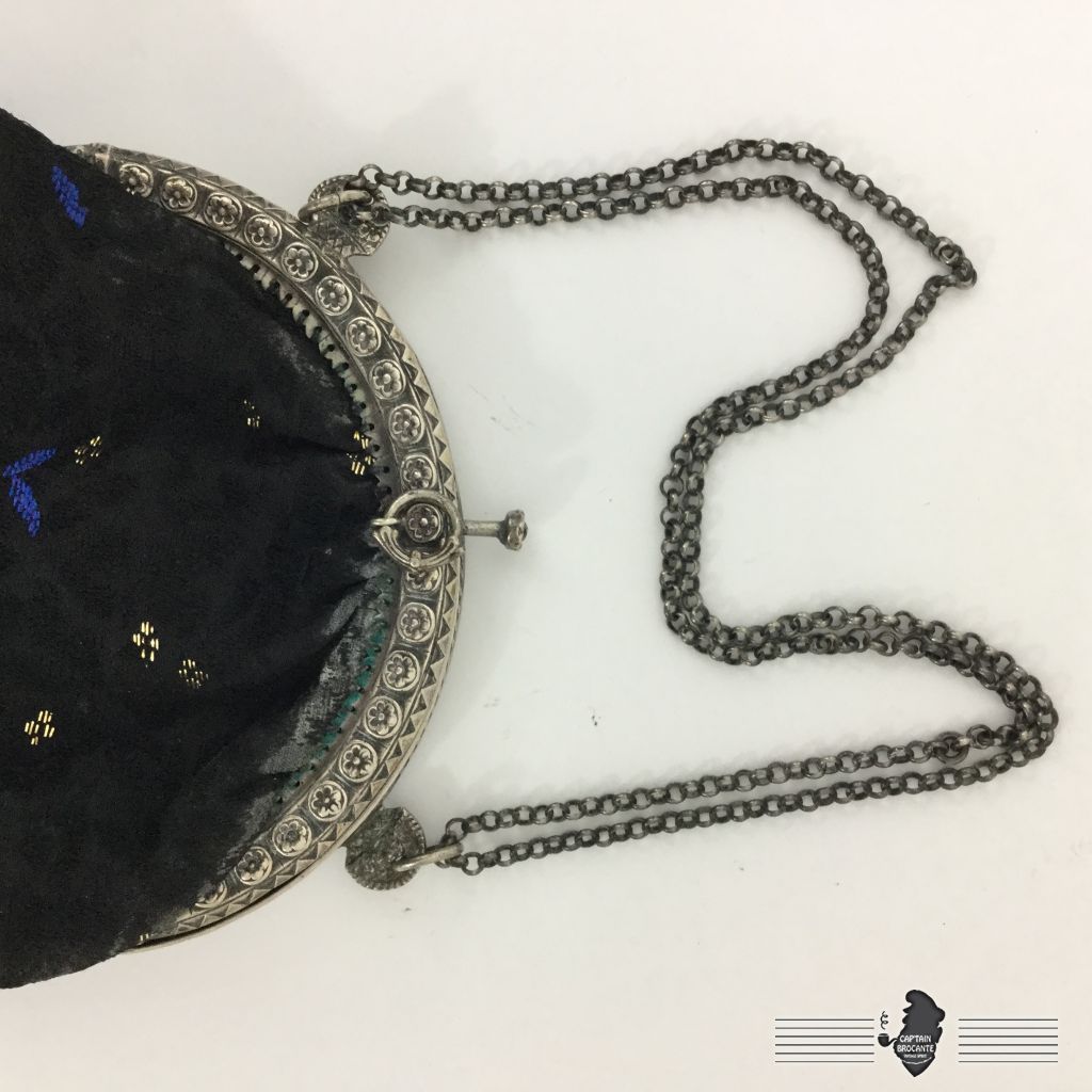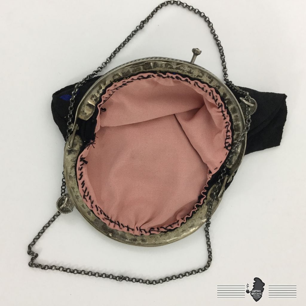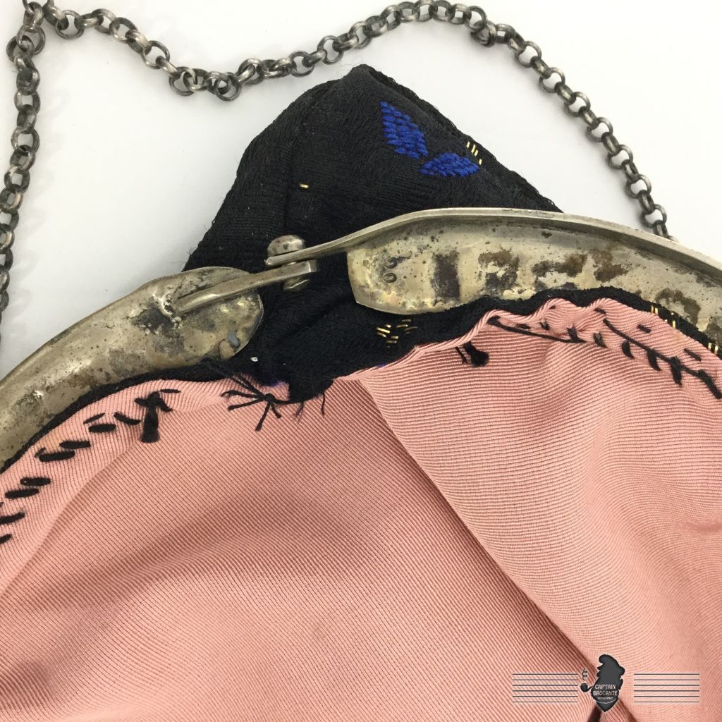 Sac en bon état, la couture à la structure n'est pas d'origine, en tissus avec broderies en cannetilles, monture marquée de deux "00" comme vu sur les photos. Ouverture par pression.