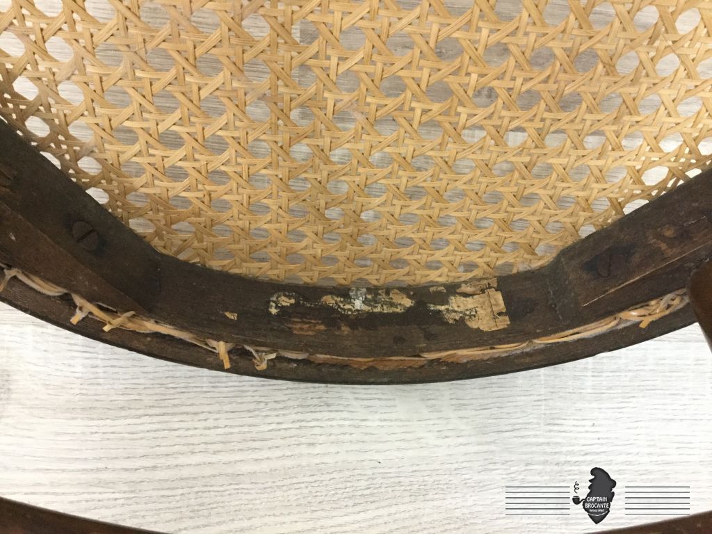 Chaise en bon état (trace d'usure), le cannage est parfait, trace d'étiquette du fabricant sous l'assise (plus d'inscription).